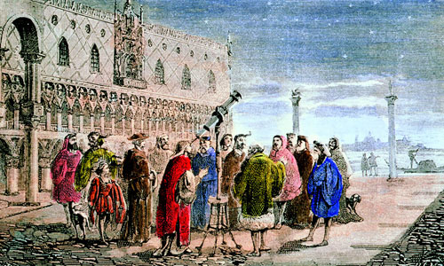 伽利略是第一个认识到望远镜将可能用于天文研究的人。虽然伽利略没有发明望远镜,但他改进了前人的设计方案,并逐步增强其放大功能。图中的情景发生于1609年8月,伽利略正在向当时的威尼斯统治者演示他的望远镜。伽利略制作了一架口径4.2厘米,长约1.2米的望远镜。他是用平凸透镜作为物镜,凹透镜作为目镜,这种光学系统称为伽利略式望远镜。伽利略用这架望远镜指向天空,得到了一系列的重要发现,天文学从此进入了望远镜时代。折射望远镜的优点是焦距长,底片比例尺大,对镜筒弯曲不敏感,最适合于做天体测量方面的工作。但是它总是有残余的色差,同时对紫外、红外波段的辐射吸收很厉害。