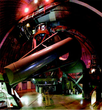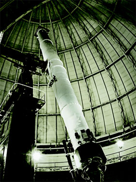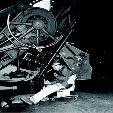这幅图片拍摄于1946年,夜间操作员吉因-汉考克正在手动操控望远镜。1908年,美国天文学家乔治-埃勒里-海耳主持建成了口径60英寸的反射望远镜,安装于威尔逊山。这是当时世界上最大的望远镜,光谱分析、视差测量、星云观测和测光等天文学领域成为世界领先的设备。虽然数年后胡克望远镜的口径超过了它,但在此后的数年中它依然是世界上最大的望远镜之一。1992年海耳望远镜上安装了一台早期的自适应光学设施,使它的分辨本领从0.5-1.0角秒提高到0.07角秒。